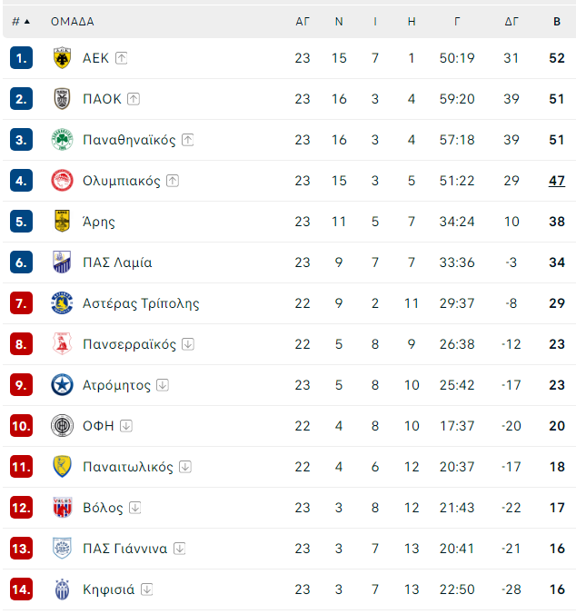 Οι Θεσσαλονικείς υποχώρησαν έτσι στη δεύτερη θέση όπου έχουν την ισοβαθμία με τον Παναθηναϊκό, την ώρα που οι Πειραιώτες ακολουθούν στην τέταρτη θέση έχοντας μαζέψει τη διαφορά από την κορυφή στους πέντε βαθμούς.