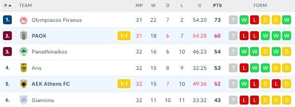 Νωρίτερα, ο Ολυμπιακός νίκησε 3-2 τον ΠΑΣ Γιάννινα με το γκολ του Ρόνι Λόπες στο 90’+8′ και του αρκεί να μη χάσει στην Τούμπα μεσοβδόμαδα, να πάρει, δηλαδή, έστω έναν βαθμό κόντρα στον ΠΑΟΚ, προκειμένου να κατακτήσει και μαθηματικά το 47ο πρωτάθλημα της ιστορίας του!