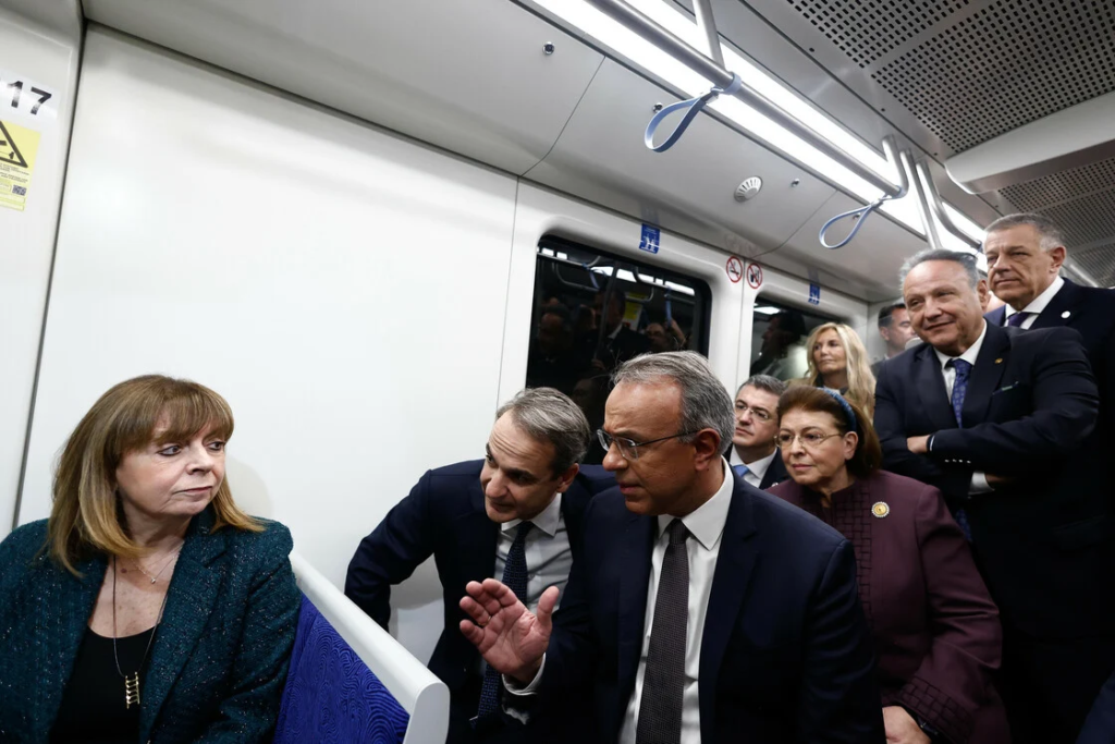 Η Πρόεδρος της Δημοκρατίας Κατερίνα Σακελλαροπούλου, ο πρωθυπουργός Κυριάκος Μητσοτάκης και ο υπουργός Μεταφορών Χρήστος Σταϊκούρας στο πρώτο βαγόνι του μετρό Θεσσαλονίκης / Φωτογραφία: Eurokinissi
