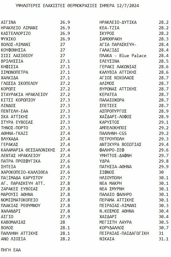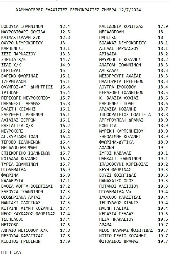 Αυτή την περίοδο στη χώρα μας καταγράφονται πολύ υψηλές μέγιστες θερμοκρασίες, ωστόσο οι ελάχιστες θερμοκρασίες σε αρκετές περιοχές κυρίως της ηπειρωτικής χώρες πέφτουν αρκετά κάτω από τους 26 βαθμούς Κελσίου. Για του λόγου το αληθές, ο Σάκης Αρναούτογλου, παραθέτει και τις μετρήσεις που δείχνουν ότι από τους 496 μετεωρολογικούς σταθμούς του Εθνικού Αστεροσκοπείου Αθηνών, οι 322 είχαν κάτω από 25 βαθμούς, 118 από τους οποίους κατέγραψαν μάλιστα και αρκετά κάτω από 20 βαθμούς Κελσίου.