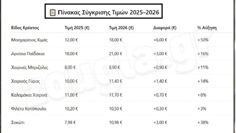 Πίνακας με τις ανατιμήσεις στα κρέατα σε σύγκριση με πέρυσι