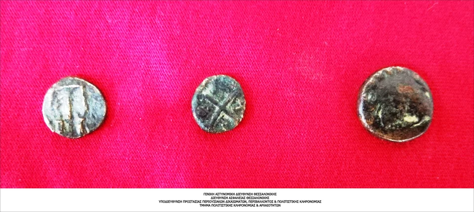Ειδικότερα, χθες το πρωί πραγματοποιήθηκε οργανωμένη επιχείρηση σε περιοχή των Σερρών, κατά την οποία διενεργήθηκε νομότυπη έρευνα στην οικία του συλληφθέντα, όπου βρέθηκαν και κατασχέθηκαν: τρία χάλκινα νομίσματα του 4ου π.Χ. αιώνα, ένας ανιχνευτής μετάλλων και δύο βιβλία που σχετίζονται με αρχαία νομίσματα.