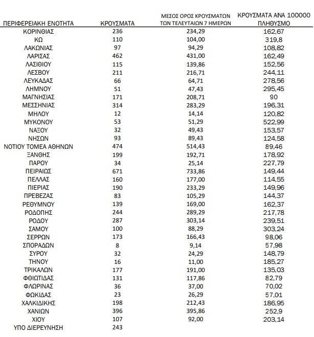 Υπενθυμίζεται πως τα περισσότερα σε αριθμό περιστατικά που είχε καταγράψει ο ΕΟΔΥ μέχρι σήμερα σε μία ημέρα ανακοινώθηκαν την Τρίτη 4 Ιανουαρίου 2022, όταν εντοπίστηκαν 50.126 περιπτώσεις σε ένα 24ωρο. Επίσης, ο μεγαλύτερος αριθμός θανάτων εξαιτίας του ιού σε ένα 24ωρο καταγράφηκε το Σάββατο 14 Δεκεμβρίου 2021, όταν έχασαν τη ζωή τους 130 ασθενείς.