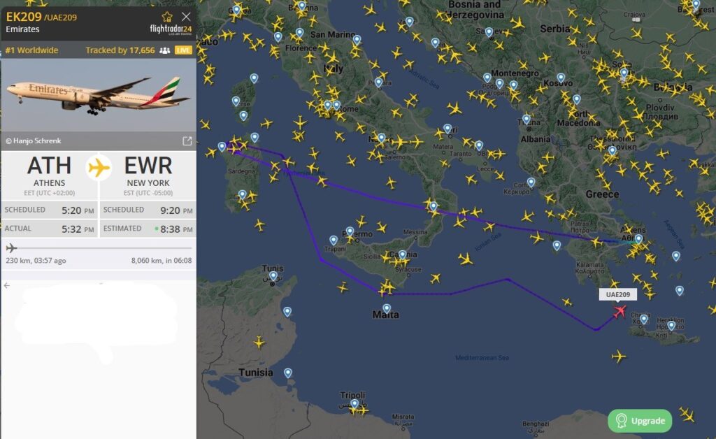 Παράλληλα, το αεροπλάνο με προορισμό τη Νέα Υόρκη (ΕΚ209) είχε απογειωθεί και βρισκόταν πάνω από την Ιταλία, όταν ο πιλότος ειδοποιήθηκε να προσγειωθεί άμεσα. Παρ’ όλα αυτά, Γαλλία και Ιταλία δεν δέχτηκαν να «φιλοξενήσουν» το αεροσκάφος στα αεροδρόμιά τους. Για αυτό το λόγο, η πτήση ΕΚ209 αναγκάστηκε να επιστρέψει στο «Ελευθέριος Βενιζέλος» για να ελεγχθεί από τις αστυνομικές δυνάμεις που βρίσκονται στο αεροδρόμιο.