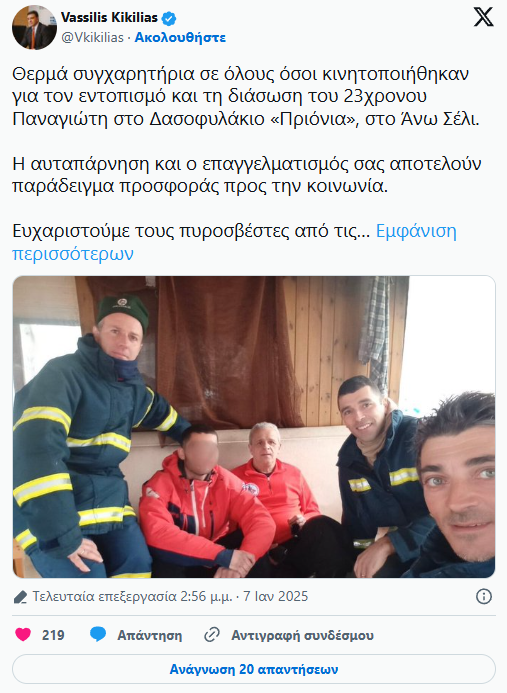 Σε ανάρτησή του ο υπουργός Κλιματικής Κρίσης και Πολιτικής Προστασίας, Βασίλης Κικίλιας, έδωσε στη δημοσιότητα την πρώτη φωτογραφία του νεαρού στο καταφύγιο με τους πυροσβέστες που τον εντόπισαν. «Θερμά συγχαρητήρια σε όλους όσοι κινητοποιήθηκαν για τον εντοπισμό και τη διάσωση του 23χρονου Παναγιώτη στο Δασοφυλάκιο “Πριόνια”, στο Άνω Σέλι», έγραψε μεταξύ άλλων ο υπουργός στην ανάρτησή του. «Η αυταπάρνηση και ο επαγγελματισμός σας αποτελούν παράδειγμα προσφοράς προς την κοινωνία» συμπλήρωσε.